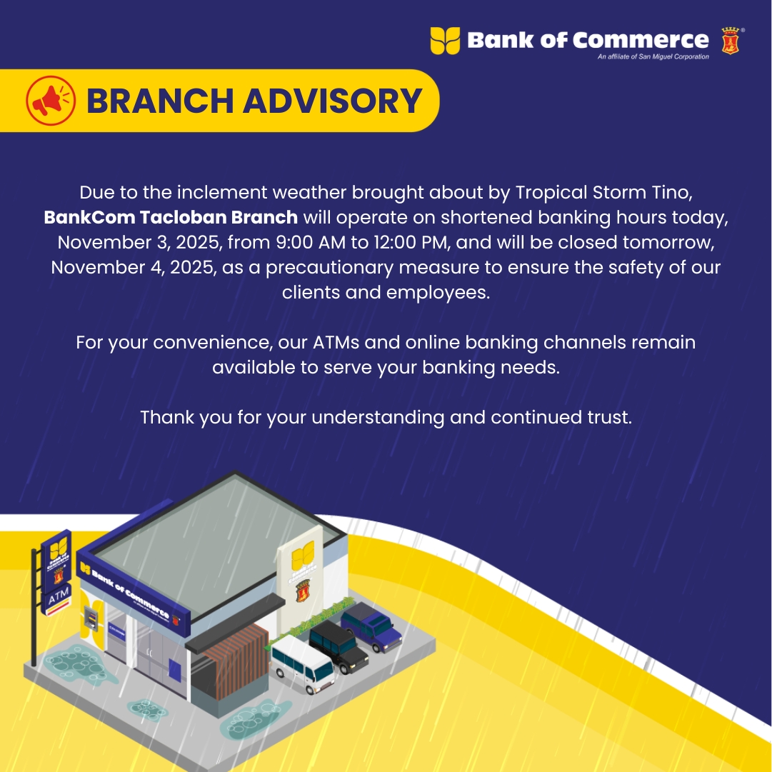 Due to the weather conditions brought by Tropical Storm Tino, BankCom Tacloban Branch will operate on shortened banking hours today, November 3, 2025, from 9:00 AM to 12:00 PM, and will be closed tomorrow, November 4 for everyone’s safety.