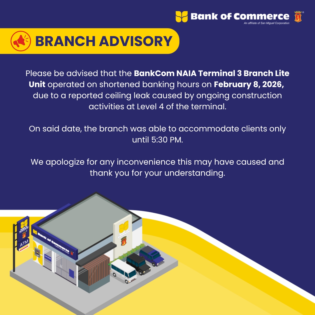 HomeAdvisoriesBRANCH ADVISORY: SHORTENED BANKING HOURS AS OF FEBRUARY 8, 2026