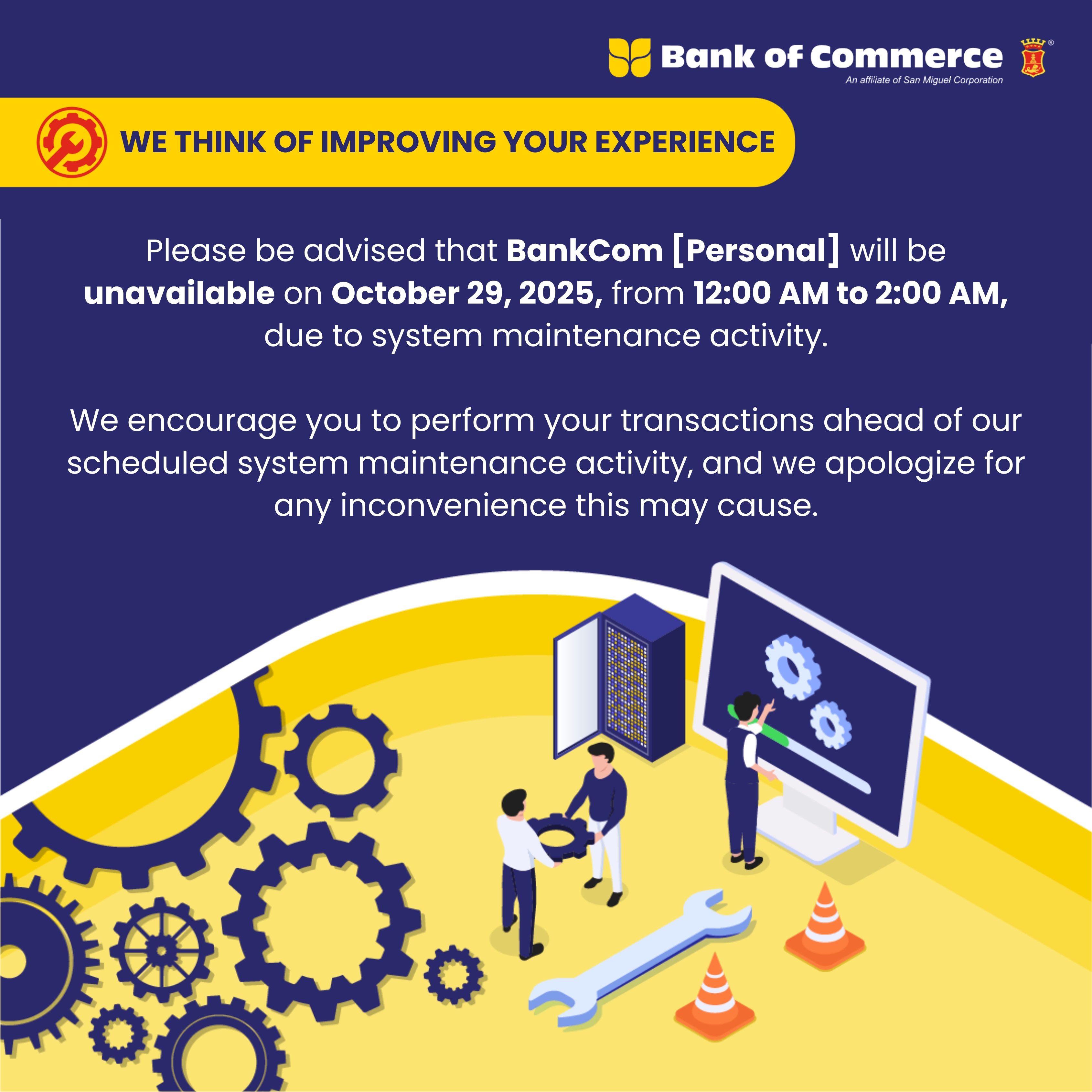 CLIENT ADVISORY: BANKCOM SYSTEM MAINTENANCE ACTIVITY ON OCTOBER 29, 2025