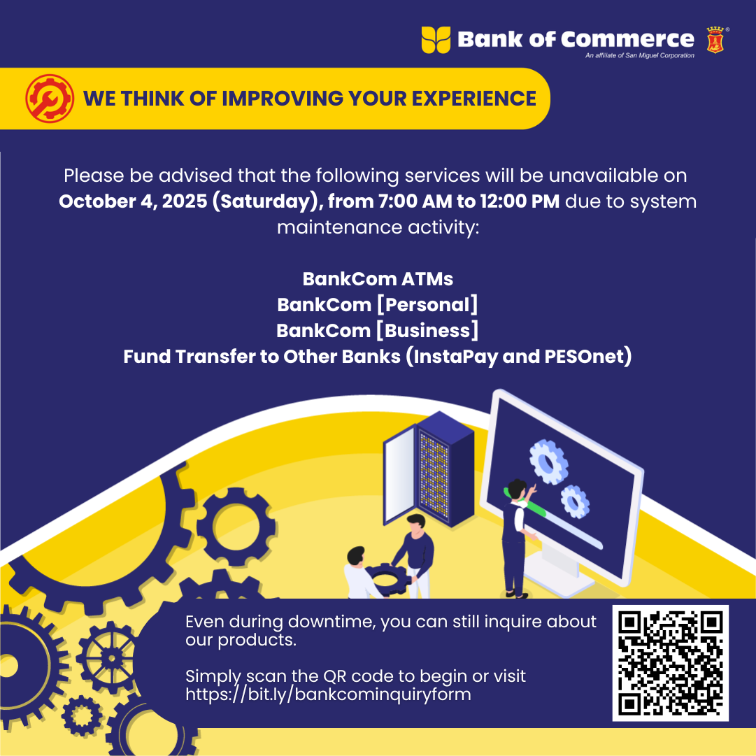 October 1, 2025 Heads up! Please be advised that the following services will be unavailable on October 4, 2025 (Saturday), from 7:00 AM to 12:00 PM due to system maintenance activity: BankCom ATMs BankCom [Personal] BankCom [Business] Fund Transfer to Other Banks (InstaPay and PESOnet) We encourage you to perform your transactions ahead of our scheduled system maintenance activity, and we apologize for any inconvenience this may cause.