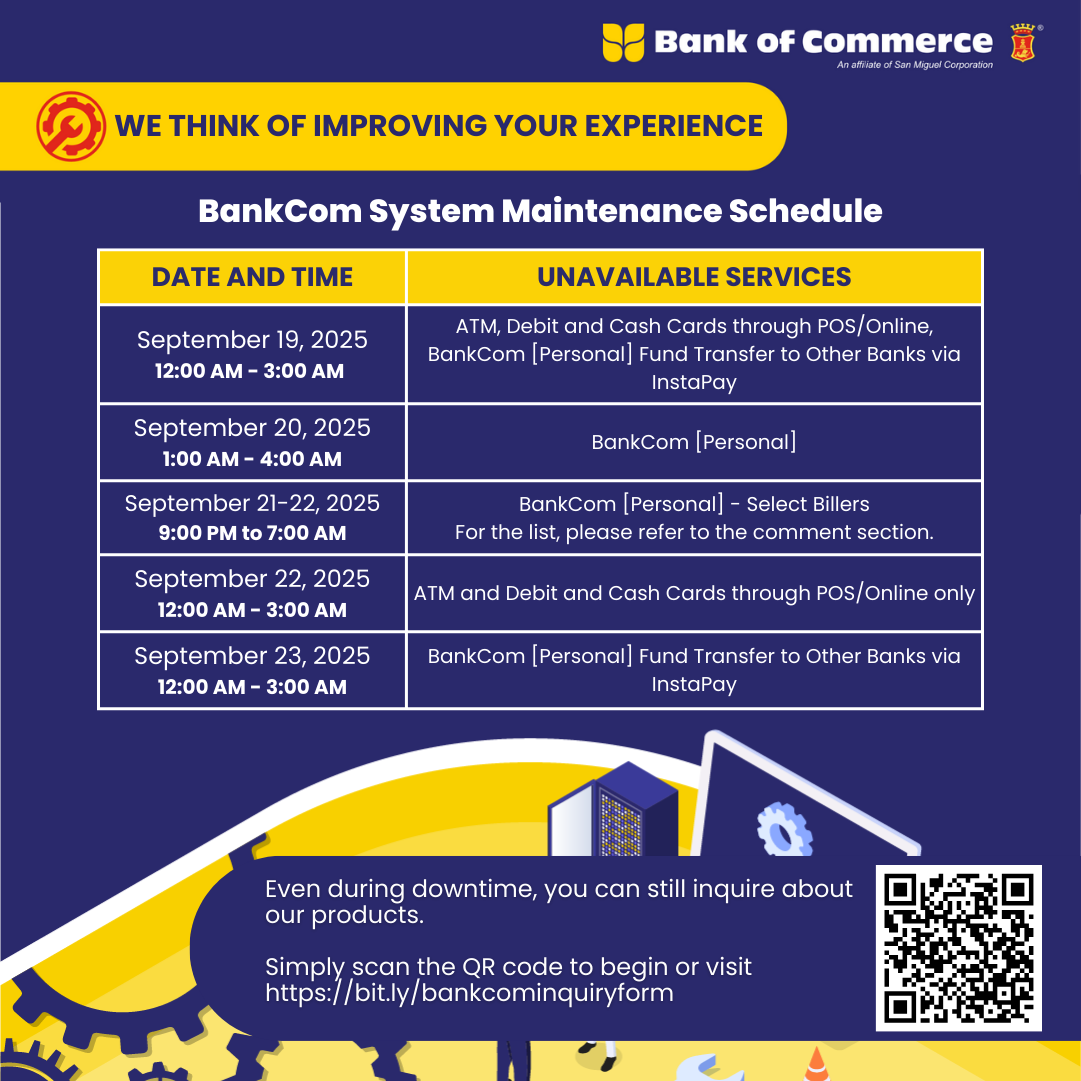 September 17, 2025 UPDATED ADVISORY: This announcement serves as an update and supersedes the previously released advisory regarding system maintenance activities. Please be informed that the following BankCom services will be temporarily unavailable on the revised dates and times indicated below, to give way to scheduled system maintenance activities: We strongly encourage you to perform your transactions ahead of the scheduled maintenance period. We sincerely apologize for any inconvenience this update may cause and thank you for your understanding.