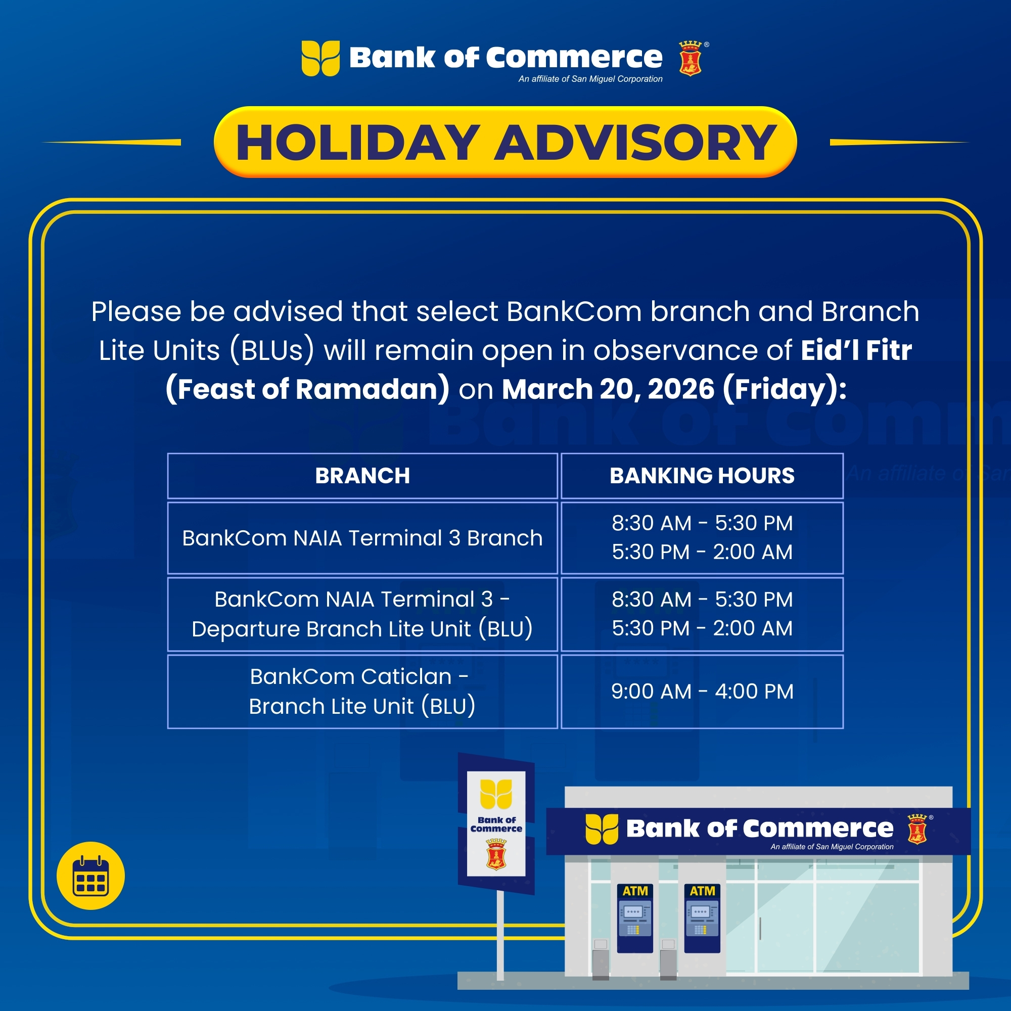 HomeAdvisoriesHOLIDAY ADVISORY: Select BankCom Branches Open on March 20 (Eid’l Fitr)