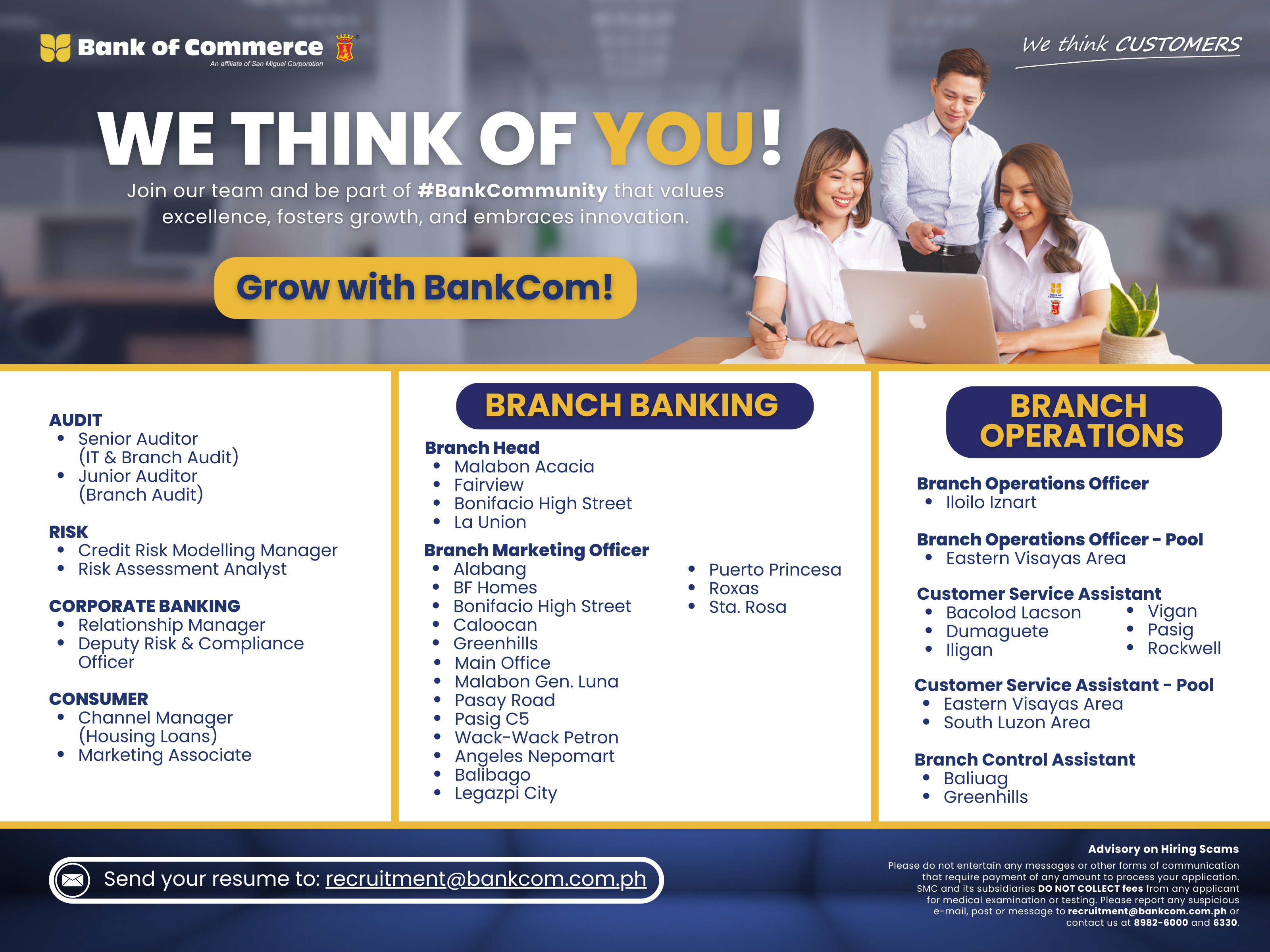 We are in need of passionate individuals seeking to build their careers in banking. A career with Bank of Commerce is personally and professionally rewarding. We are interested in hiring friendly, attentive individuals who are committed to carrying out our mission, improving lives and becoming a trusted resource to our discerning clients. We offer attractive benefits and invest in the well-being and career growth of all our employees. Cultivate your career with our growing family. Click here for the list of our job vacancies: Head Office and Branch Banking Email your resume to recruitment@bankcom.com.ph Or send it to Recruitment & Employee Information Department, 21st floor, No. 7 San Miguel Properties Centre building, Saint Francis Street, Mandaluyong City Or you may contact Our trunk line 8982-6000 locals 6334 and 6330