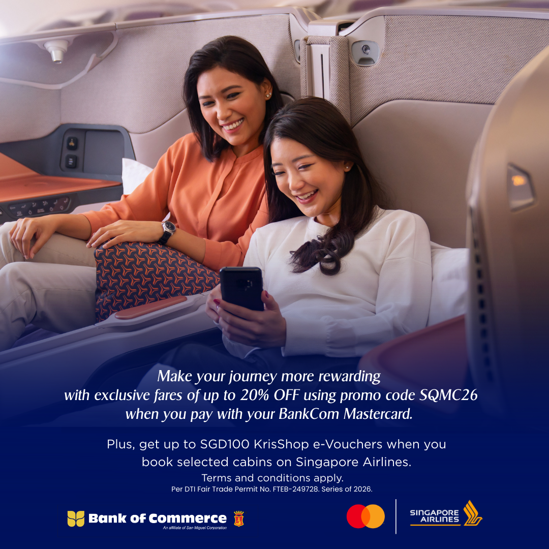 Featured Promo!Special Fares and Rewards of Up to SGD100 Await You with Singapore Airlines when you use your BankCom Card! PROMO MECHANICS BankCom X Mastercard Singapore Airlines Promo Offers Enjoy exclusive Singapore Airlines fares of up to 20% OFF when you book using promo code … Read more