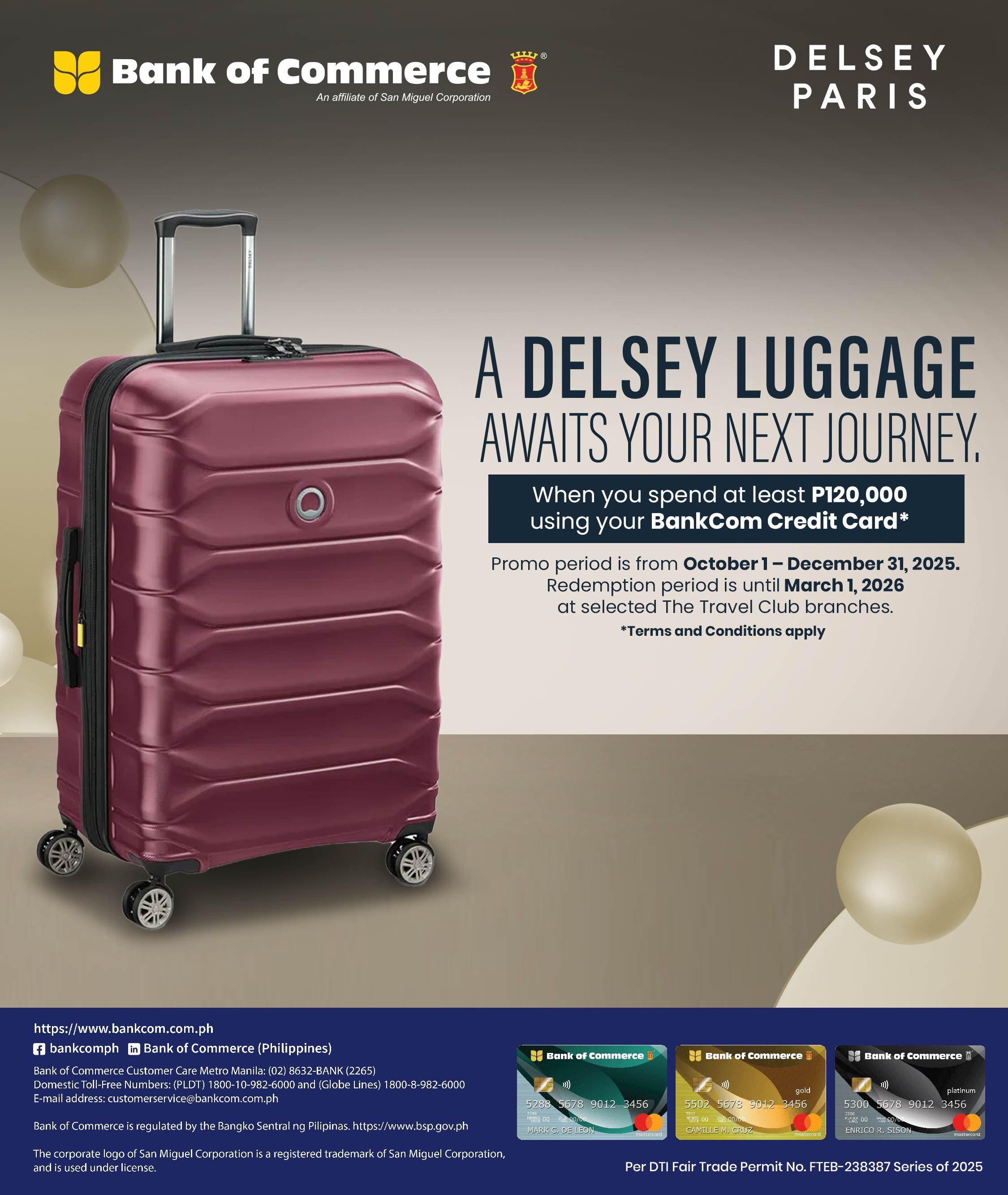 1. Cardholders may avail of the promo only once during the promo period. In case the Cardholder is found by Bank of Commerce to have made multiple, invalid or fraudulent redemptions, Bank of Commerce reserves the right to charge the prevailing cost of the Delsey Luggage to the cardholder’s BankCom Credit Card account or directly collect from the cardholder.